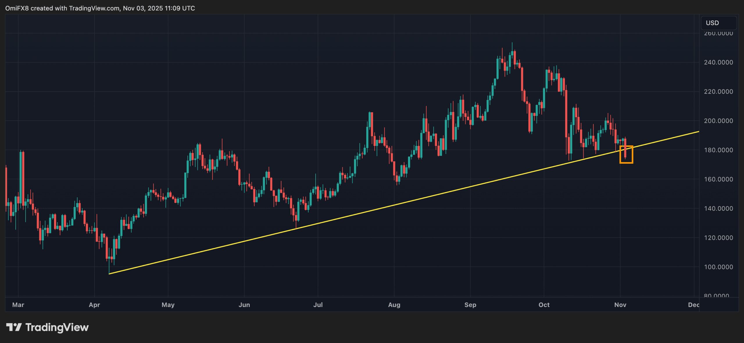 - Solana’s price has dropped below the trendline connecting April and June lows.