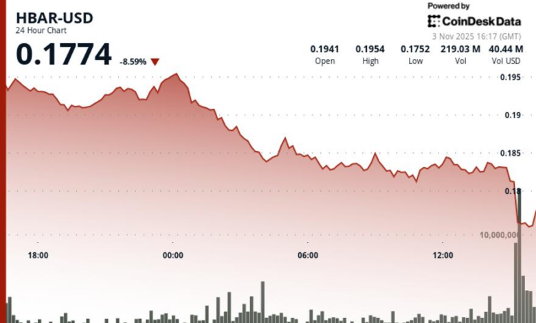 Hedera’s HBAR token slid 5% over the past 24 hours, falling from $0.1932 to $0.1835 after breaching critical support at $0.1900. Sellers maintained control through the overnight hours, driving prices to test fresh lows near $0.1815 before signs of stabilization emerged.