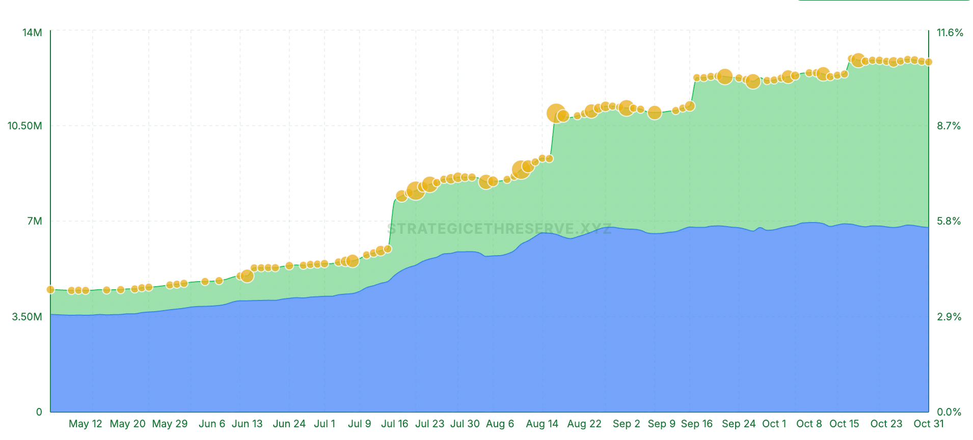 Data from StrategicETHreserve.xyz indicates that collective holdings of strategic reserves and ETFs have dropped by 124,060 ETH since Oct. 16.