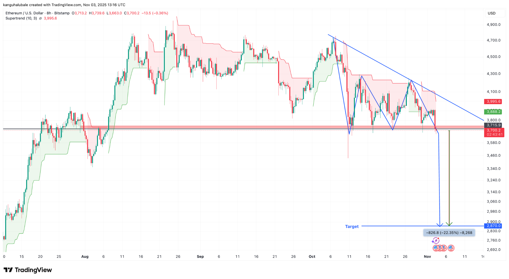Pillows said that ETH price is at a “crucial support zone” around $3,700, adding that a deeper drop to $3,500 was possible if $4,000 is not quickly reclaimed.