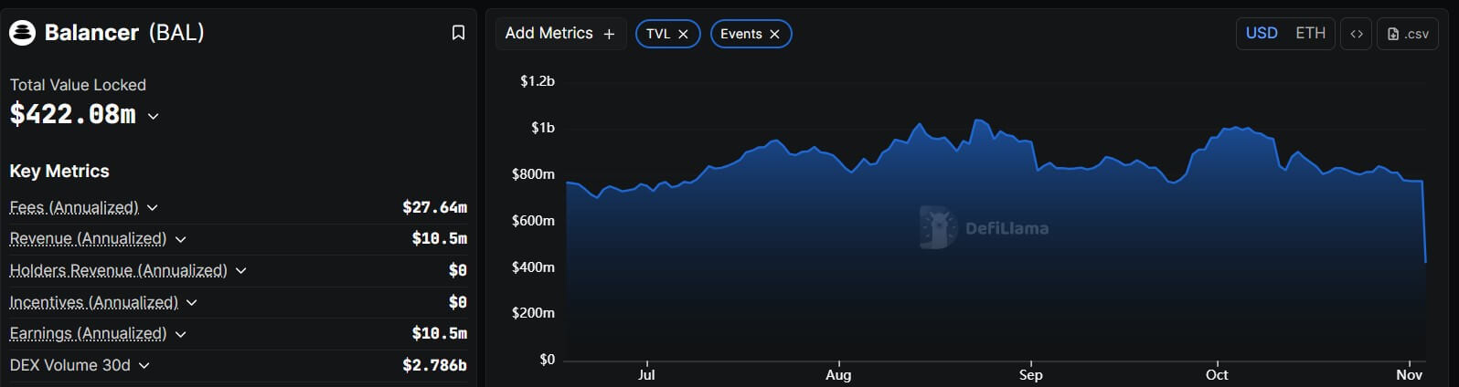By the end of the day, DeFiLlama data showed that Balancer’s total value locked (TVL) had decreased by 46% to approximately $422 million from $770 million as of press time.