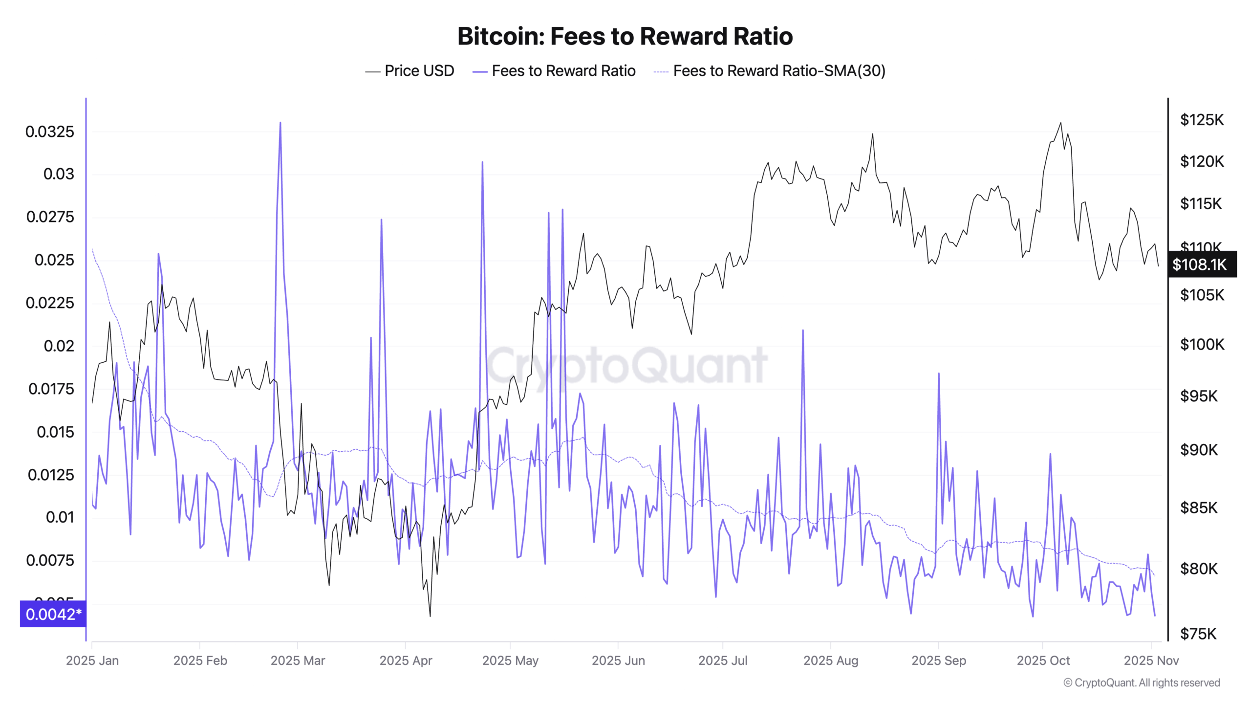 The ratio matters because it shows us how Bitcoin’s security is funded. When users pay higher fees, they effectively share in the cost of maintaining the network. When fees thin out, that burden shifts back to the subsidy: the 3.125 BTC created with every block. With the block reward fixed, miners rely more on the BTC/USD exchange rate itself. At $110,000, the network remains profitable, but the correlation is obvious: a soft tape in price now translates directly into pressure on miner margins.