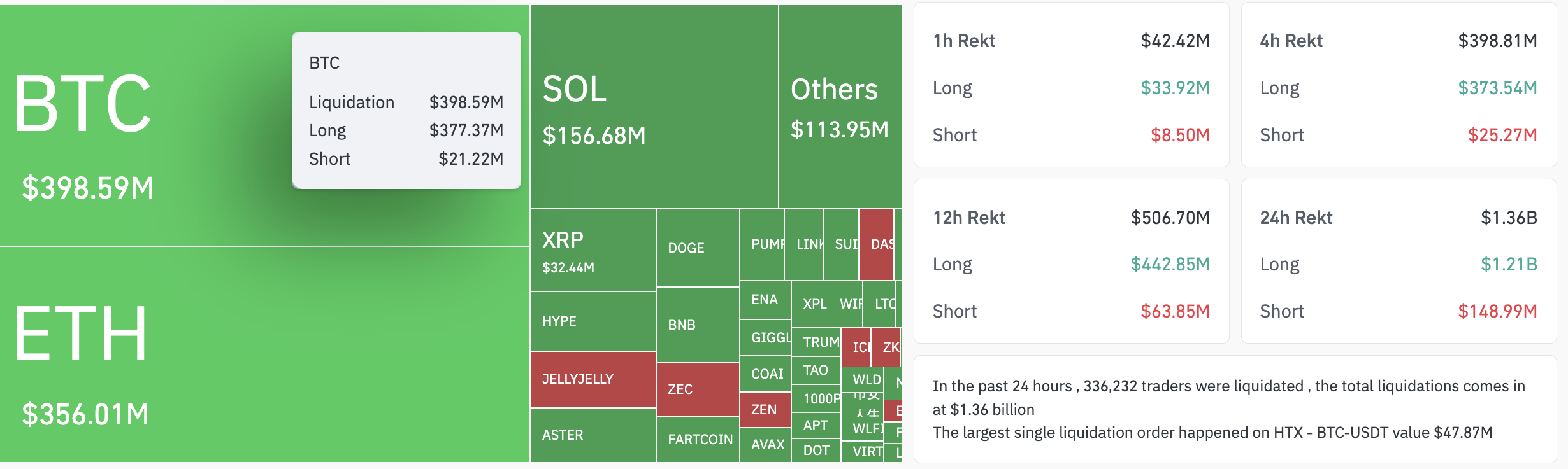 Across the board, a total of $1.36 billion was wiped out of the market in short and long positions, as shown in the figure below.
