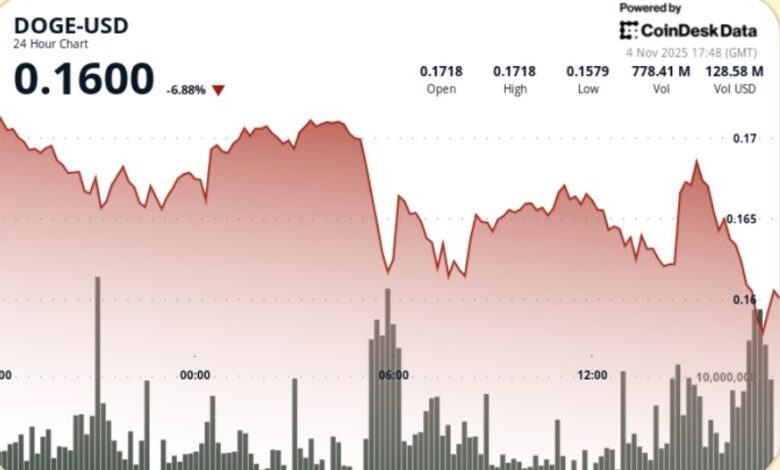 • Final-hour cascade flushed price to $0.1600 on 59M DOGE block sell