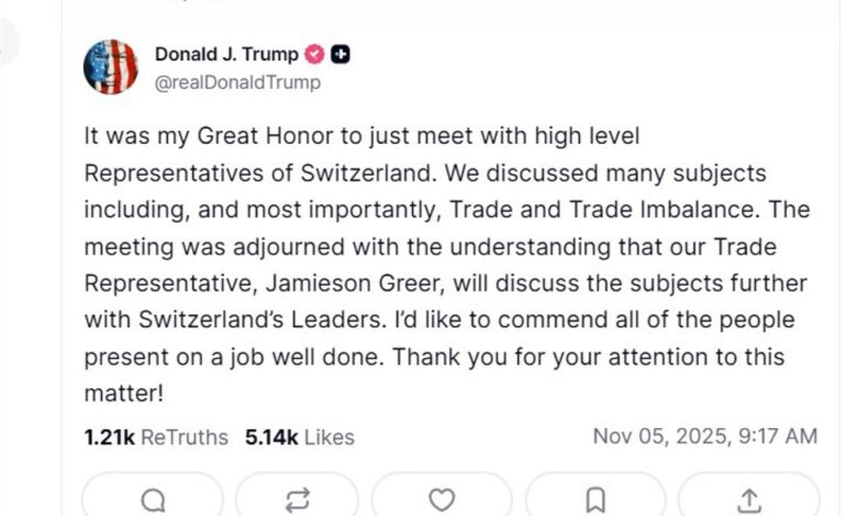 “The meeting was adjourned with the understanding that our Trade Representative, Jamieson Greer, will discuss the subjects further with Switzerland’s Leaders,”