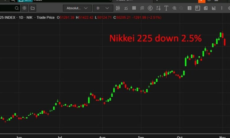 US equity indexes fell on Tuesday and that is being echoed here in Asia. Chinese markets are yet to open, but Japan’s benchmark Nikkei 225 is down 2.5%