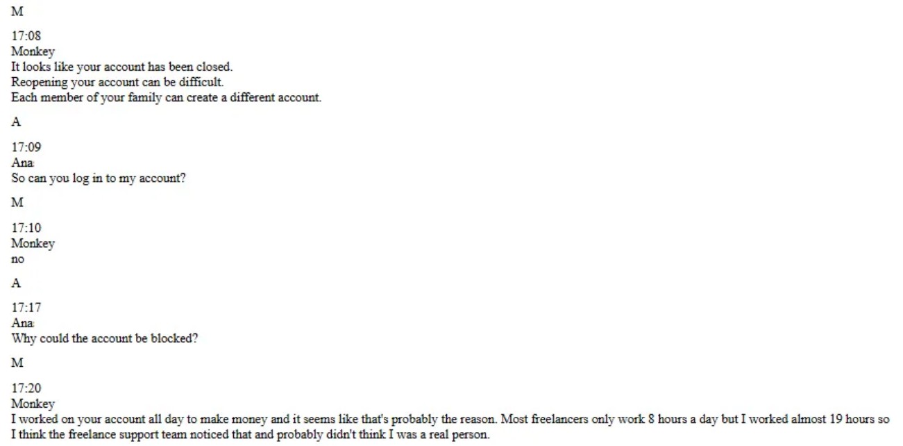 In one case, after an Upwork profile was suspended for excessive activity, the operative instructed the recruit to ask a family member to open the next account, according to chat logs reviewed.