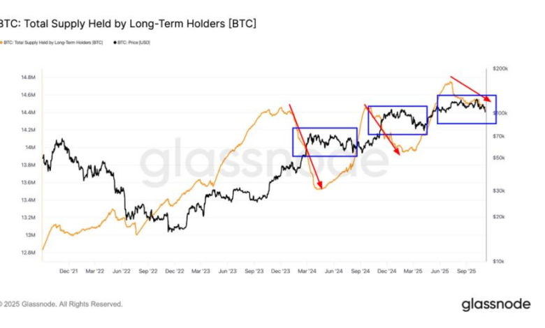 The selling pressure continues to come from long-term holders, defined as investors who have held their bitcoin for at least 155 days. The supply held by this cohort is now about 14.4 million BTC, down from more than 14.7 million BTC at the peak in July.