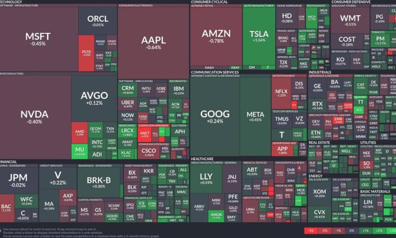- Technology: The tech sector experiences a minor pullback overall. Microsoft (MSFT) is down 0.45%, and Oracle (ORCL) sees a negligible decrease of 0.01%.