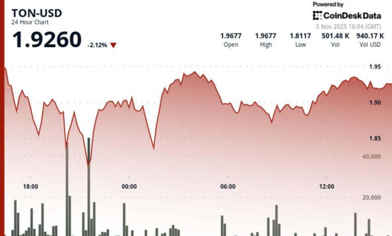 The sell-off hit altcoins especially hard. The wider market, as measured via the CoinDesk 20 (CD20) index fell just 0.2% over the same period, pushed up by bitcoin’s 1.4% rise. TON, which had briefly touched a low of $1.8117, struggled to hold support near $1.90, with prices carving out lower highs, according to CoinDesk Research’s technical analysis model.