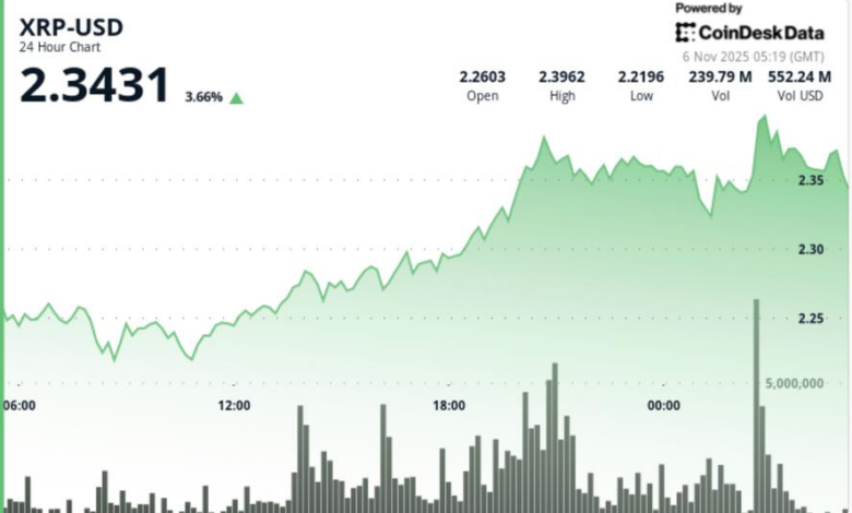 XRP rallied 4.9% to $2.35 in Tuesday’s session, breaking through key $2.30 resistance on near-doubled institutional volume. The move marked the token’s strongest daily gain in a week and outperformance against a declining broader market, with traders now eyeing a clean push toward $2.50.