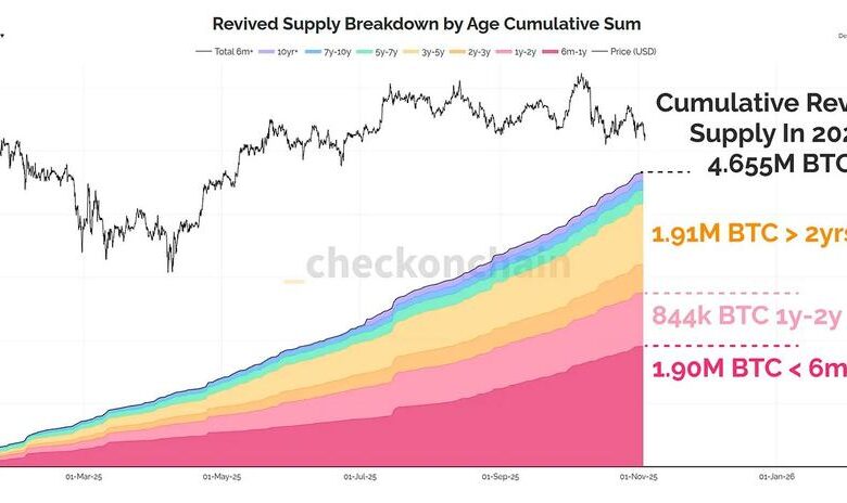 According to analyst James Check, also known as Checkmate, the cumulative revived supply the total amount of coins returning to circulation after being dormant for more than six months has reached 4.655 million BTC in 2025. This breaks down as follows: