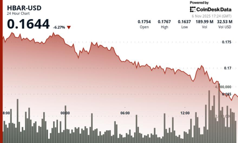 HBAR Slips 2.6% to $0.1691 as Support Test Draws Heavy Volume