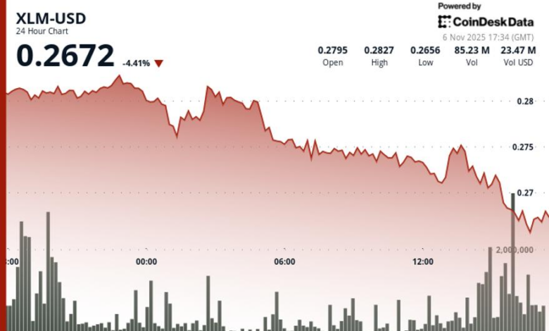 Stellar (XLM) extended its recent slide on Tuesday, falling 2.2% from $0.2789 to $0.2727 as resistance at $0.2815 once again capped upside momentum. The token traded within a $0.0124 range, reflecting 4.5% intraday volatility, while a series of lower highs confirmed the prevailing bearish bias. Support remains near $0.2709, bolstered by repeated tests of the psychological $0.27 level.