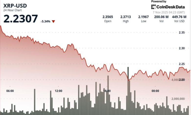 XRP fell 7.5% over 24 hours, sliding from $2.40 to $2.22 in a broad-based selloff that accelerated after the token breached the $2.28 technical support. The breakdown unfolded alongside a surge in trading volume that reached 137.4 million, representing an 84% spike above the daily average.