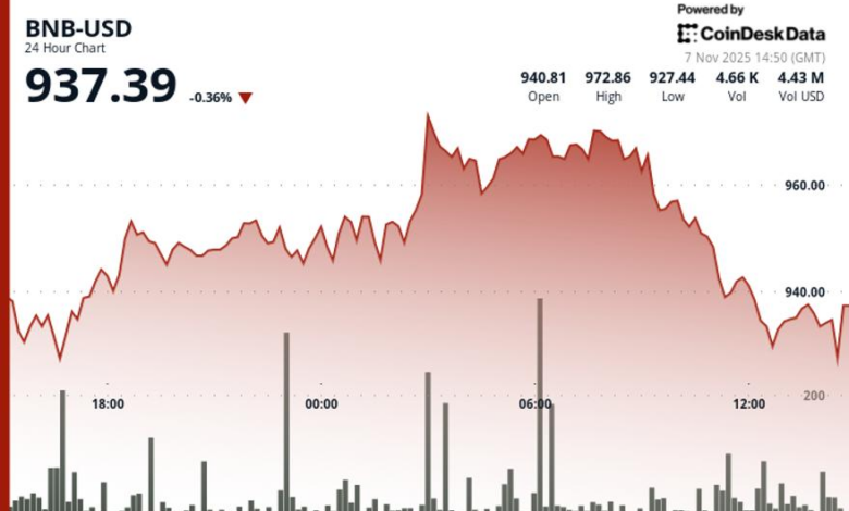 The native token of the BNB Chain, BNB, slipped slightly over the last 24-hour period, moving to $933 after briefly surging to $974, as broader crypto markets showed signs of stress tied to tightening financial conditions.