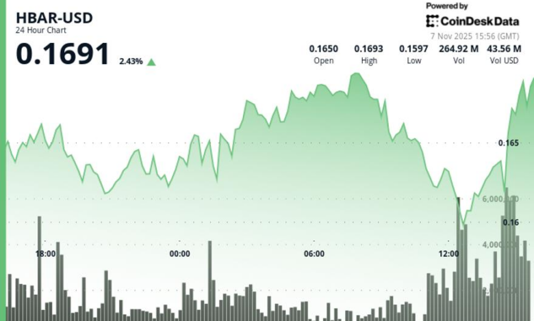 HBAR trades in volatile range-bound action during the 24-hour period ending Nov. 7, dropping from $0.1672 to $0.1634 for a 2.3% decline.