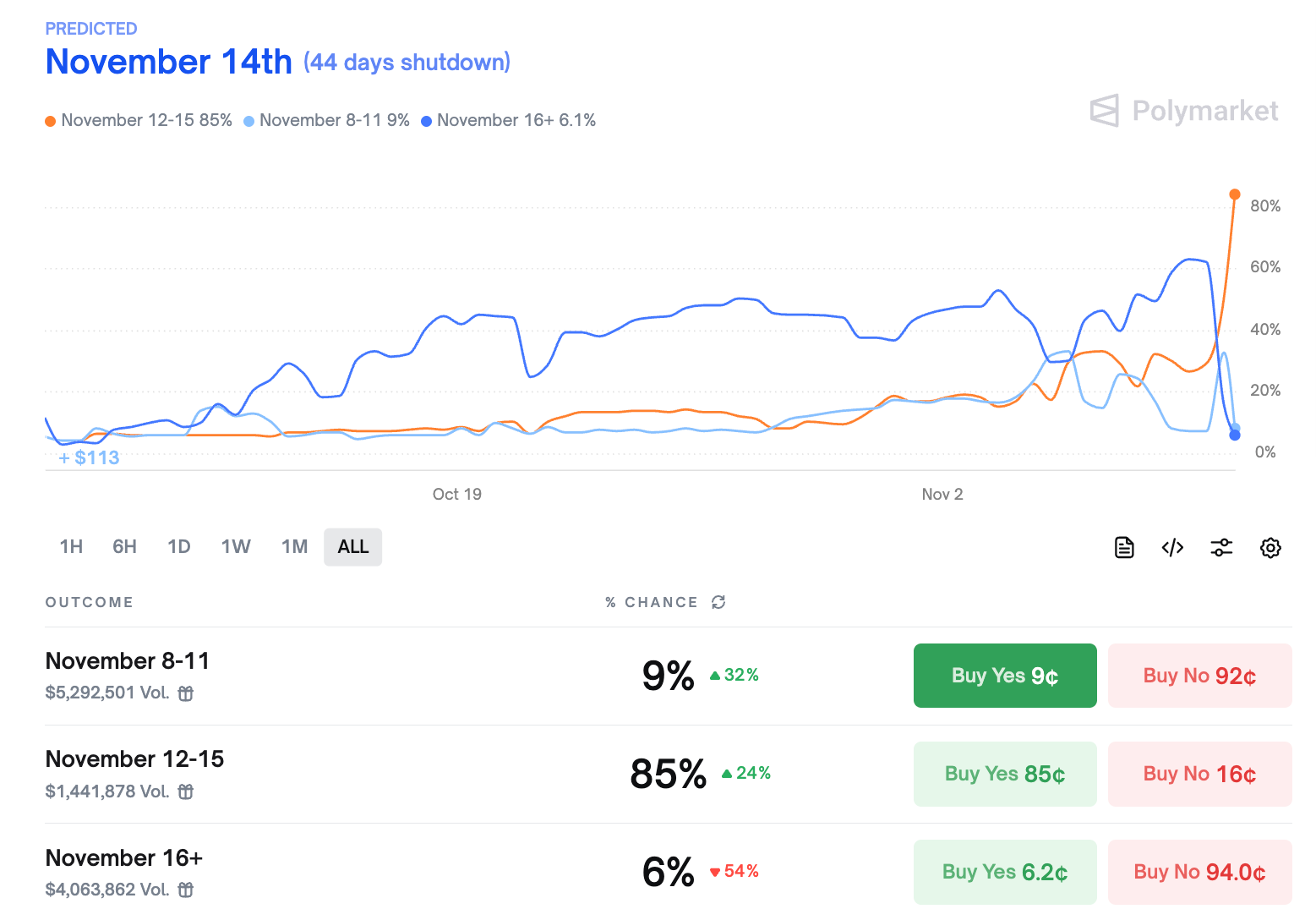 Following this news, prediction markets flipped sharply, with Polymarket bettors placing the odds of the government shutdown ending between Nov. 12 and Nov. 15 at 85%.