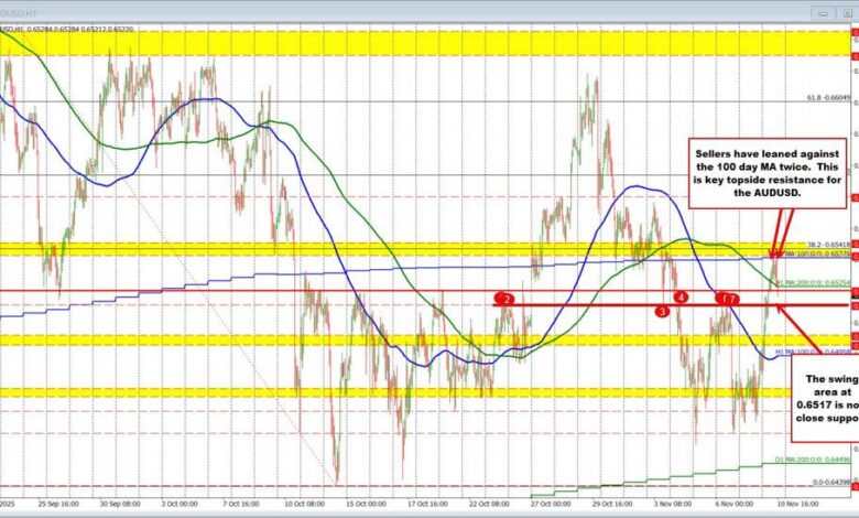 In early Asian trading, the pair opened near the 100-hour moving average around 0.6496, where buyers quickly stepped in to drive the price higher. The advance pushed the pair through a series of key resistance levels, including the 0.6500–0.6504 swing zone, Thursday’s 0.6518 ceiling, and another swing area near 0.6524, which aligned with the 200-hour moving average. The rally extended to test the 200-day moving average at 0.6538, where sellers have twice capped further gains heading into the U.S. session.