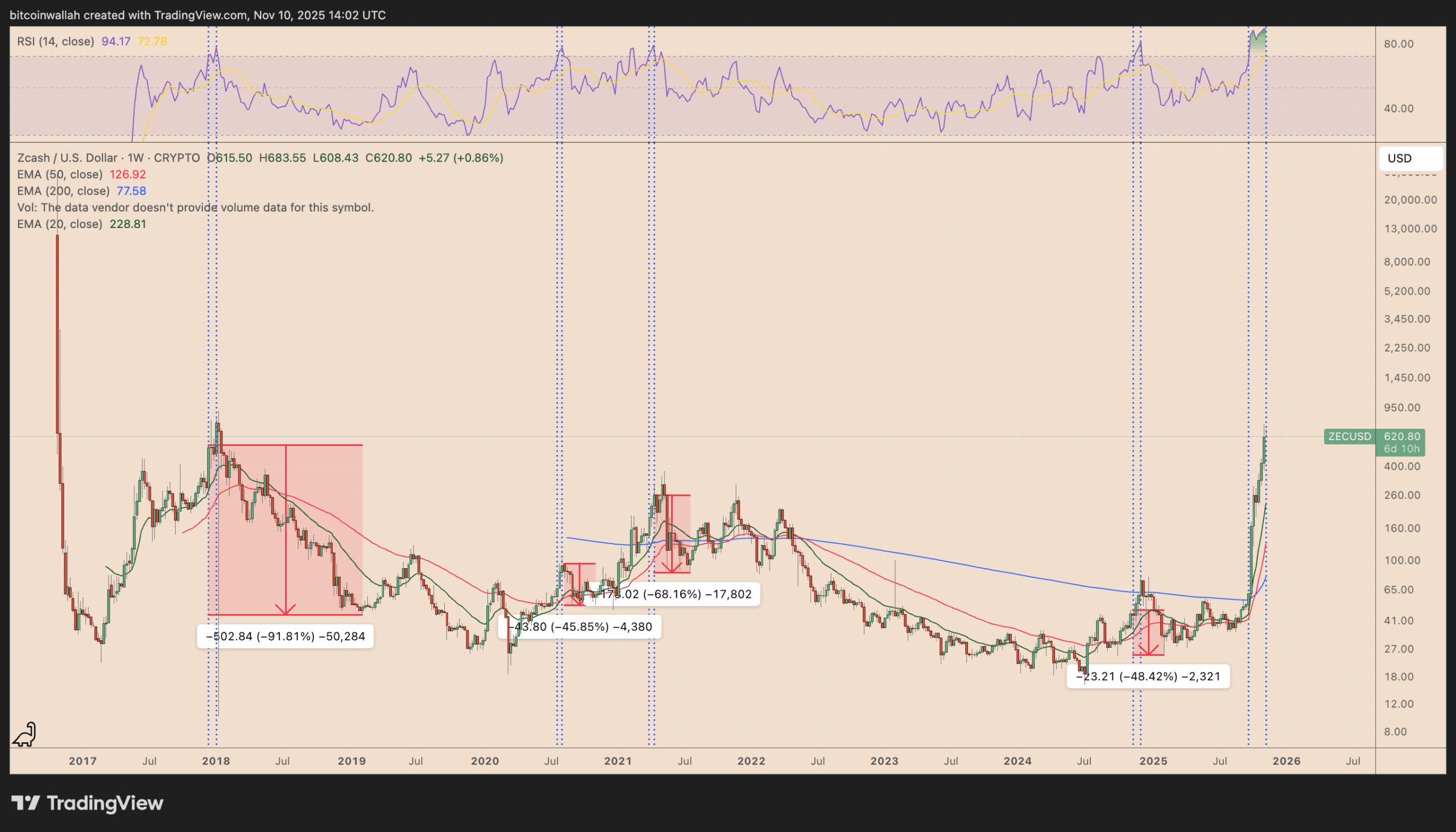 Historically, ZEC’s price can continue to rally for several weeks after entering the overbought zone above 70, often followed by sharp multimonth corrections ranging from 45% to over 90%.