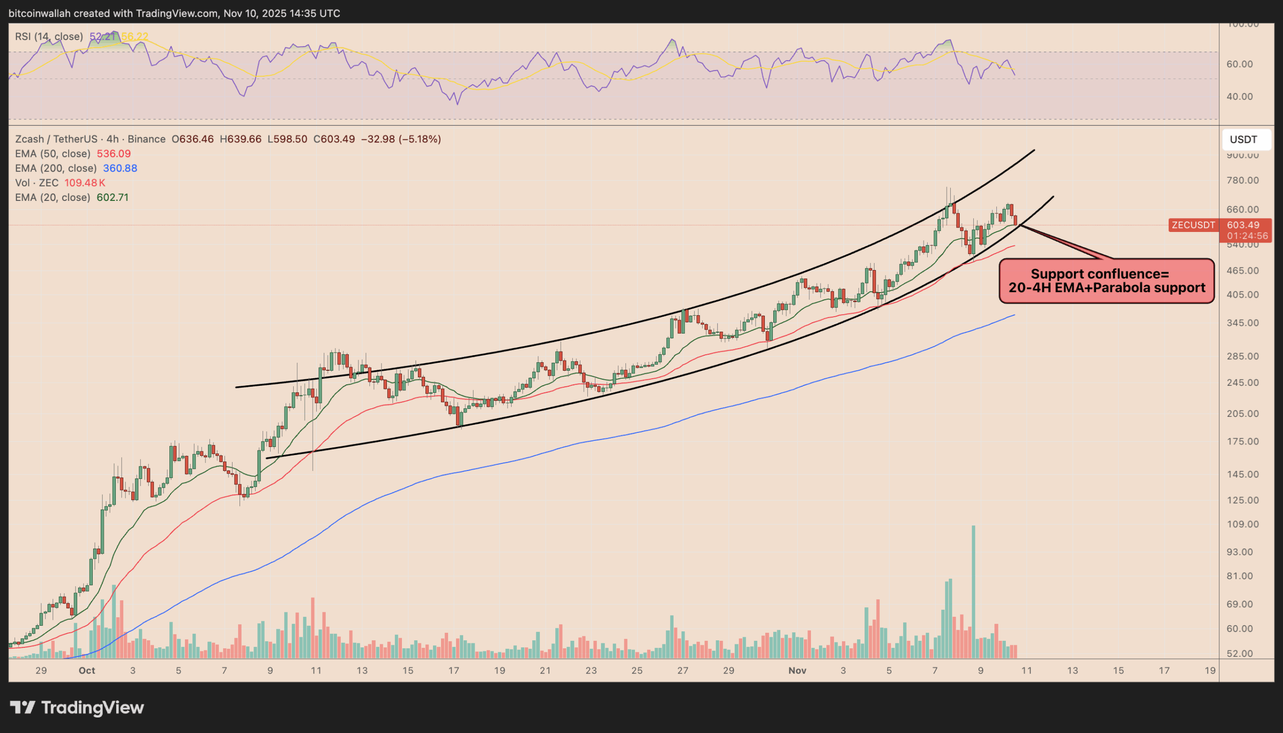 On the 4-hour chart, ZEC remains within a steep parabolic channel, currently testing a key support confluence formed by the 20-EMA and the lower parabola trendline.