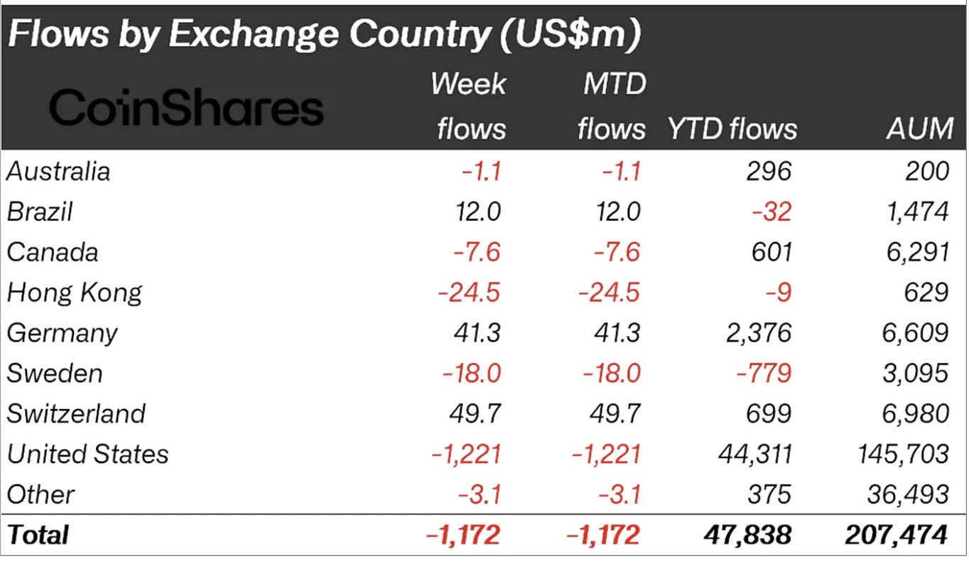 The United States led redemptions with $1.22 billion, while Germany ($41.3 million) and Switzerland ($49.7 million) continued to record inflows, emphasizing the regional divergence between US and Euro-zone sentiment.