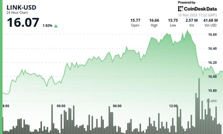 Chainlink’s native token LINK rebounded on Monday, advancing 5.2% over the 24-hour period to a session high of $16.66 before profit-taking kicked in.