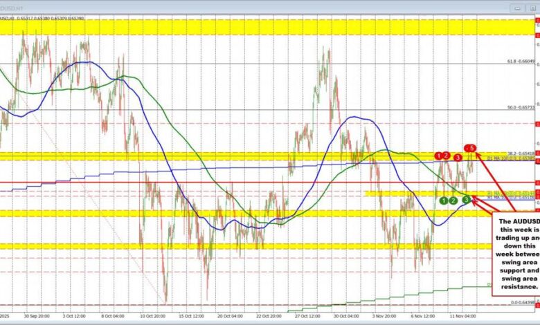 Looking at the downside, the lows from Monday afternoon, Tuesday, and again in today’s Asian session all found support within a key swing zone between 0.6514 and 0.65176. The 200-hour MA (now at 0.6514) and the rising 100-hour MA (currently at 0.65116) are also converging near that support, reinforcing its importance.