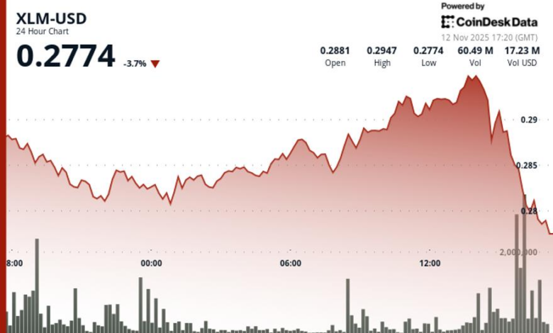 A wave of heavy selling hit late on Nov. 11, with volume surging to 36.08 million tokens—47% above the 24-hour average—forcing a break below key support at $0.2845. The sell-off pushed XLM to lows near $0.2810 before buyers stepped in to stabilize prices.
