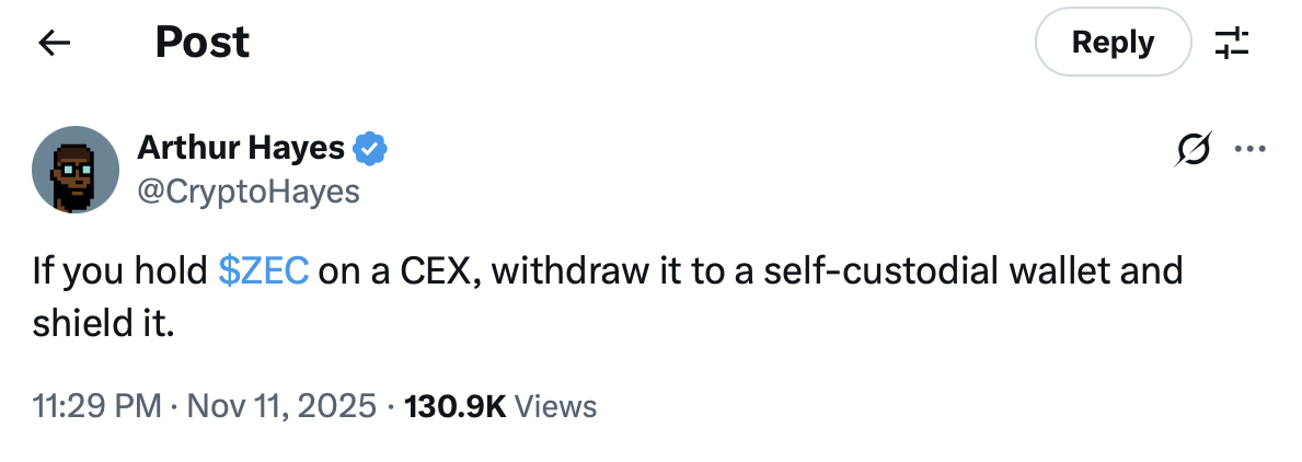 On Wednesdays, Hayes told Zcash holders to move their tokens off centralized exchanges and into self-custody, telling users on X to “shield” their assets for private transactions.