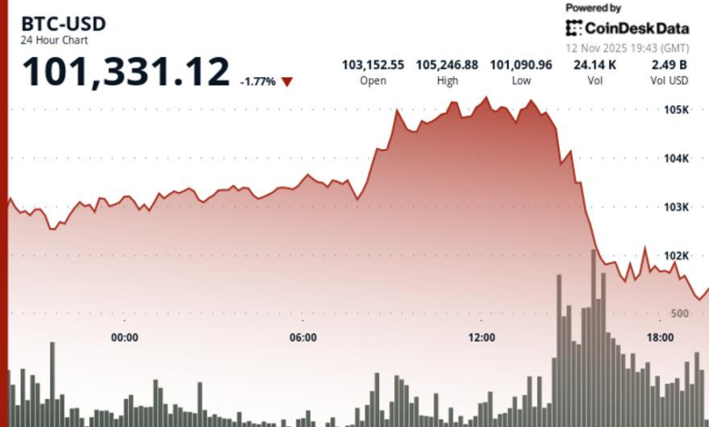 According to CoinDesk Research’s technical analysis data model, bitcoin pulled back from recent peaks Tuesday, sliding from $103,413 to $101,775 as the world’s largest cryptocurrency consolidated below key $102,000 resistance. The 1.24% decline unfolded on tepid volume just 2.11% above seven-day averages, signaling cautious market participation despite proximity to the critical $100,000 psychological support level.