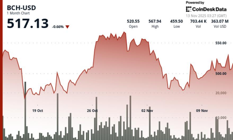According to CoinDesk Research’s technical analysis data model, posted solid gains during Wednesday’s session, advancing 1.9% from $508.32 to $518.01 amid heightened volatility across crypto markets. The move established clear bullish momentum within a $32.78 trading range, representing 6.4% intraday volatility as BCH outperformed while most altcoins stumbled at key resistance zones.