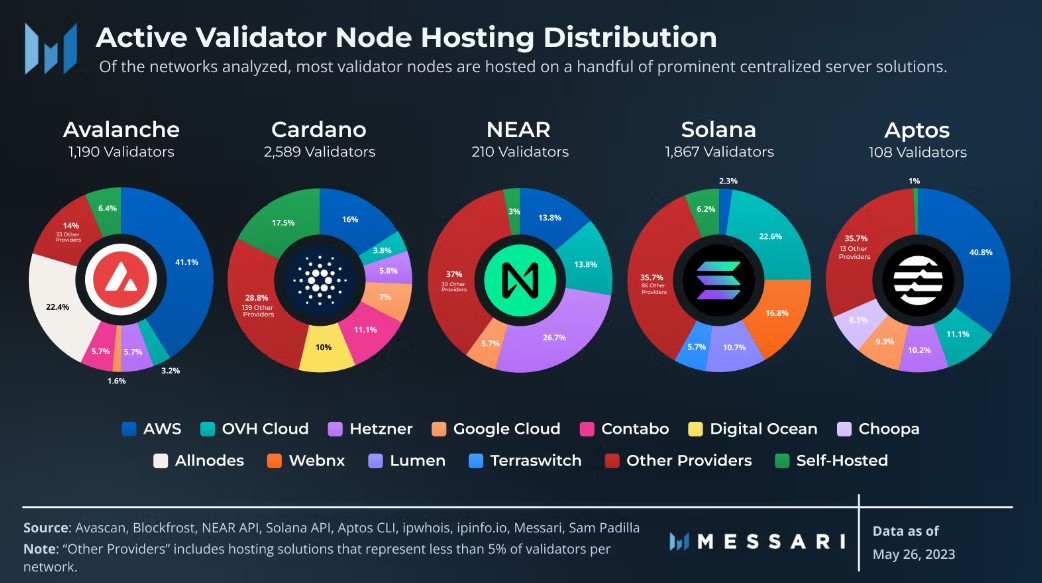A study presented at the Usenix Security Symposium in August identified Amazon Web Services as the single largest hosting provider among the Ethereum validators it was able to map, accounting for roughly one in five. Separately, a 2023 analysis by Messari found that most validators and stake hosting use centralized servers.