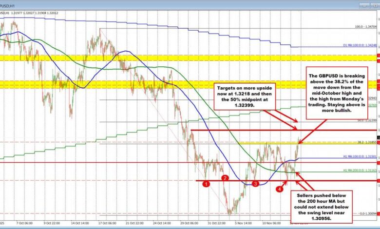 The GBPUSD is moving to the new highs and in the process has now moved above the highs from Monday and Tuesday and the 38.2% of the move down from the mid-October high. That area comes in between 1.31855 to 1.31902 . The price is now trading just above 1.3200.