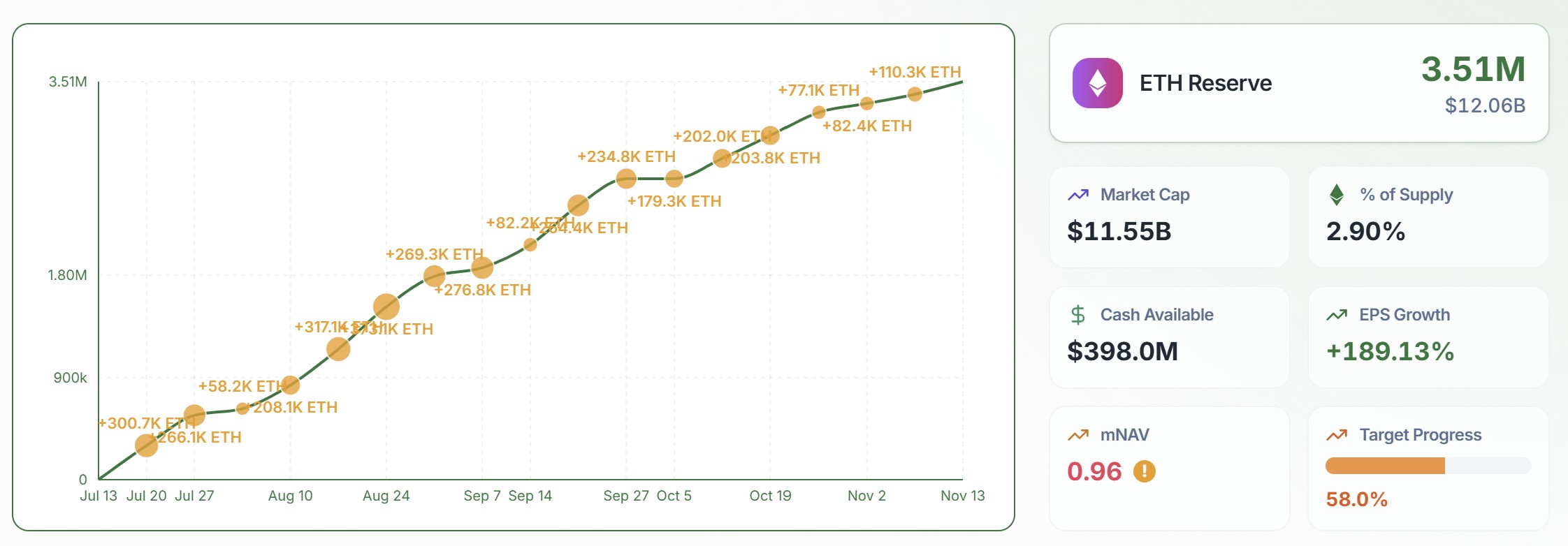 Although strong ETH inflows into Ether Treasuries held by companies have stagnated in Q4 (for context, it increased 124% in Q3), Bitmine continued to add more ETH to its allocation, increasing its total to 3,505,723 ETH, adding 110,288 ETH on Nov. 10.