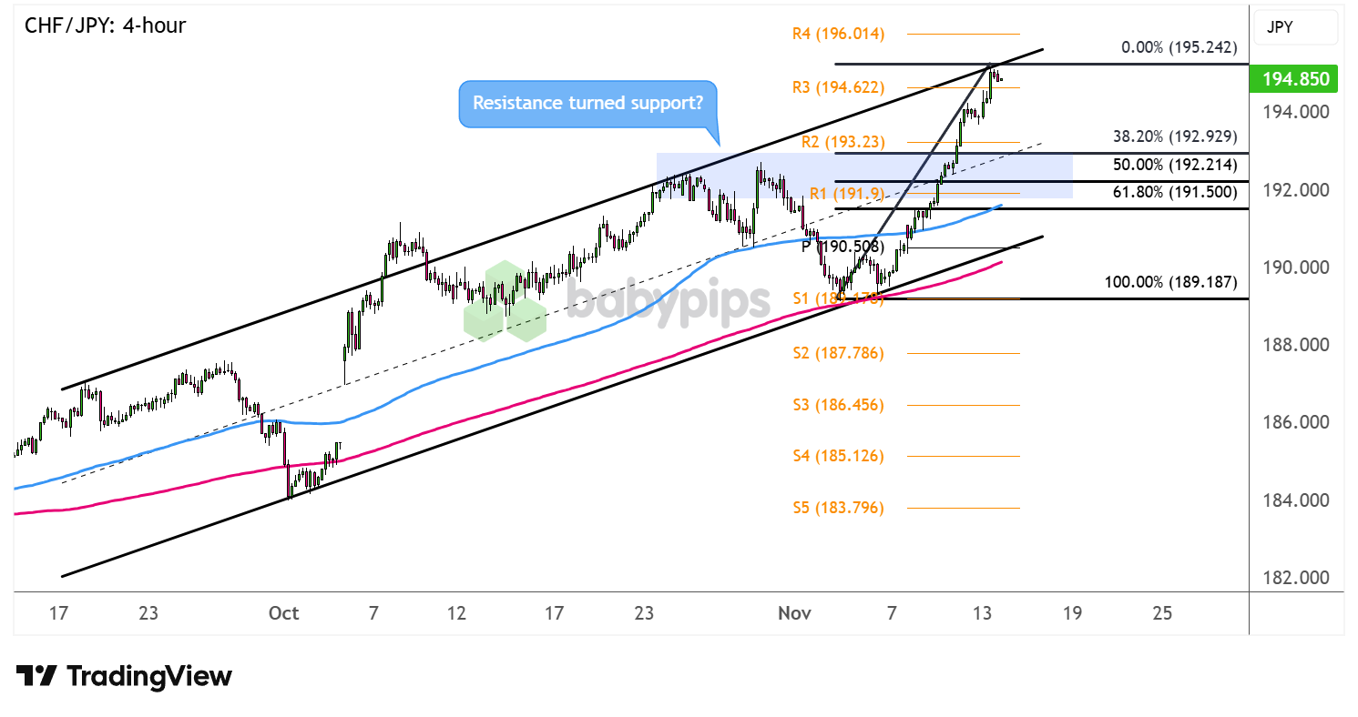 CHF/JPY could dip to the 38.2% Fib level, which is near R2 (192.23), or the 50% retracement closer to the 192.00 major psychological level and a broken resistance zone that could hold as support.