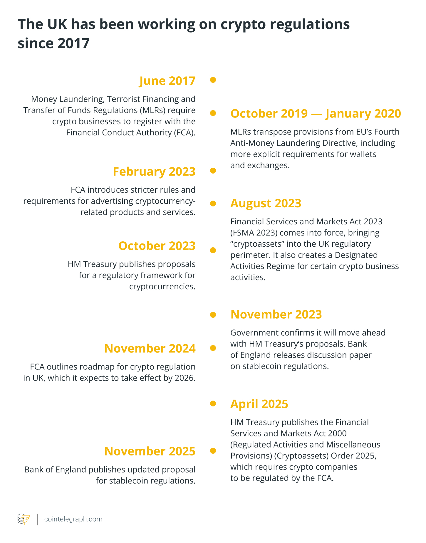 The British government has been working on crypto regulations since 2017, when it first adopted Anti-Money Laundering and Know Your Customer requirements for crypto-related businesses like exchanges. Now, eight years later, the central bank is still developing its policies based on industry feedback.