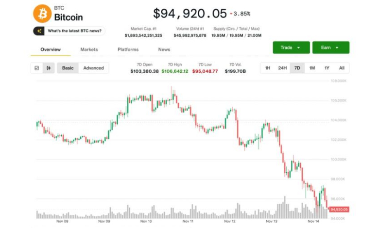 Bitcoin saw no bounce Friday, holding at session lows below $95,000 late in the U.S. day after a bruising week that dragged prices to their lowest since May.