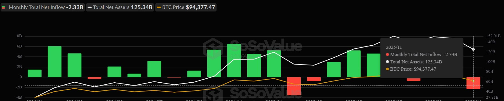 This mechanical pressure was intensified by institutional outflows, which began quietly in mid-to-late October. This month, Bitcoin ETFs have experienced more than $2 billion in outflows, marking their second-largest negative month since their launch in 2024.