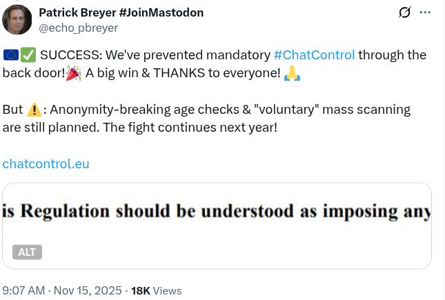 Breyer wrote in his X post that only mandatory chat control was removed from the proposal, which still contains anonymity-breaking age checks for communication services and voluntary mass scanning. He added that “the fight continues next year!”