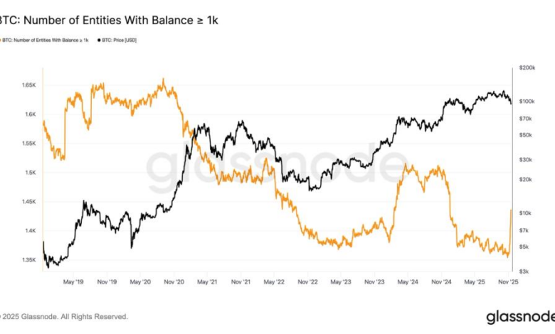 Over the past week the number of unique entities holding at least 1,000 BTC has climbed to 1,436 even as bitcoin has tumbled and held firmly below $100,000.