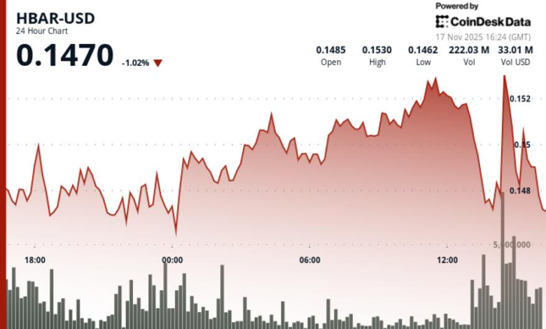 HBAR fell sharply on Tuesday, sliding 2.5% from $0.1518 to $0.1480 after breaking below a key support level that triggered a wave of fresh selling. The move followed a spike in trading activity late on Nov. 16, when 168.9 million tokens changed hands — a 94% jump above average — signaling heavy institutional distribution.