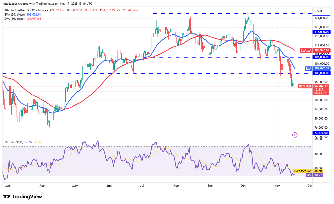 Time is running out for the bulls. They will have to swiftly drive the Bitcoin price above the 20-day EMA ($102,022) to weaken the bearish momentum. The BTC/USDT pair may then climb to the 50-day SMA ($109,927).