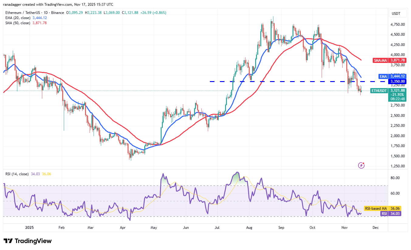Ether (ETH) has been trading below the breakdown level of $3,350, but the bears have failed to sink the price below $3,000.
