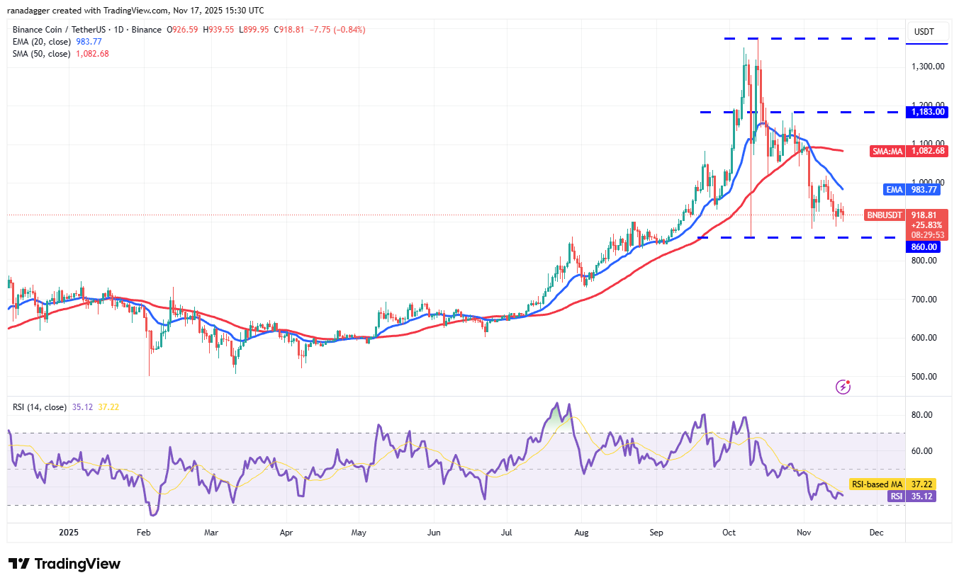 BNB (BNB) is attempting to stay above the $860 level, but the recovery is expected to face selling at the 20-day EMA ($983).