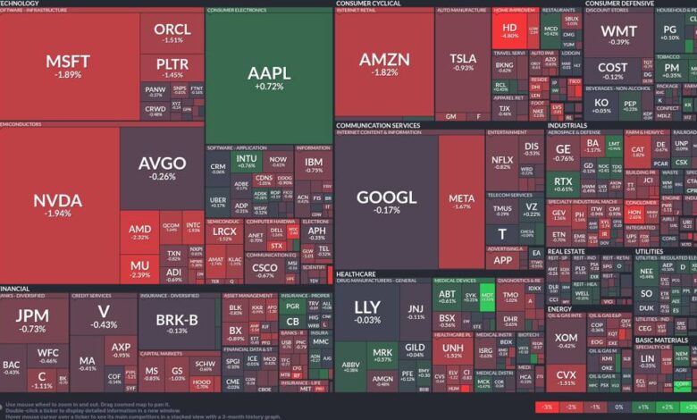 - 🚨 Technology: The technology sector is under noticeable pressure with notable decliners such as Microsoft (MSFT) down by 1.89% and Nvidia (NVDA) dropping 1.94%. The broader sentiment appears bearish with widespread declines attributed to potential overvaluation concerns or recent market news.