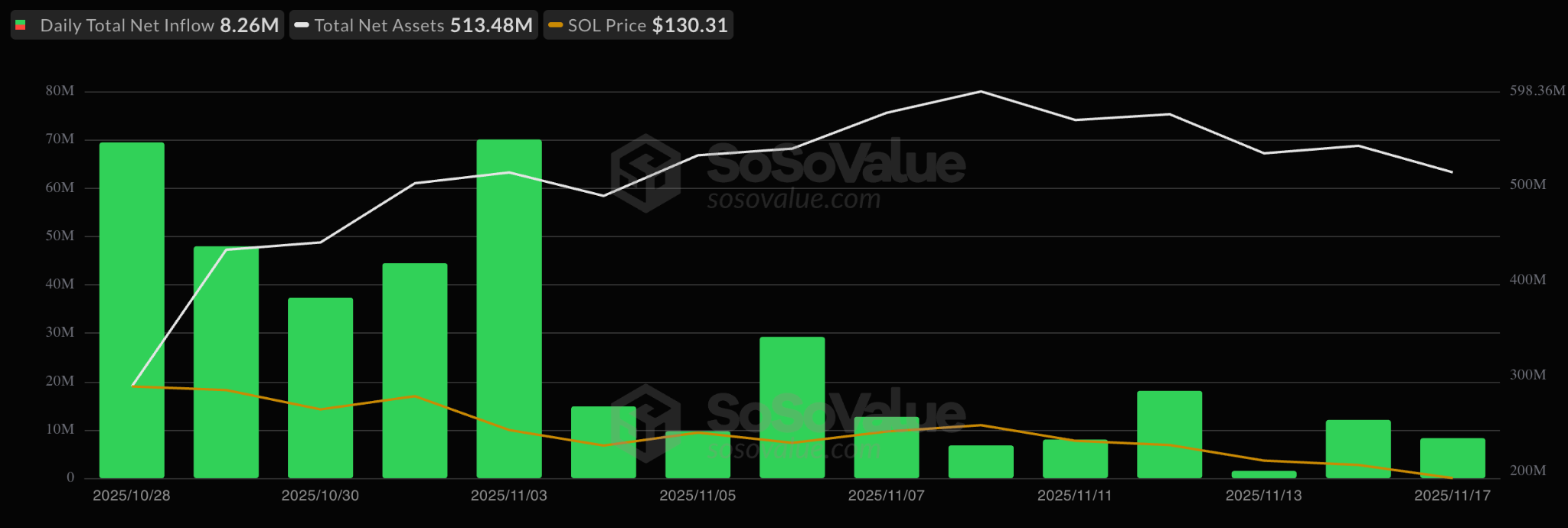 US-based SOL ETFs added $8.26 million on Monday, bringing cumulative inflows to $390 million and total net assets to over $513 million, per SoSoValue data.