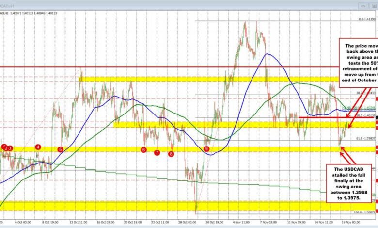 The next key upside markers are the 50% midpoint of the post-October range at 1.40135, followed by the near-converged 100- and 200-hour MAs between 1.4022 and 1.4024. Earlier this week, price lows repeatedly held near the 50% level and the 100-hour MA, so I would expect initial resistance on the first test of those moving averages, with stops likely triggered on a clean break above. Conversely, if the pair finds willing sellers against those MAs and moves back below the 50% and stays below, the 1.4000 level is back in play with the battle reigniting at the area.