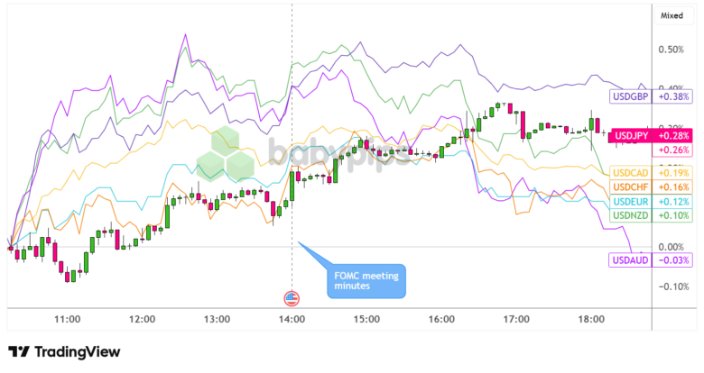 However, gains against commodity currencies were limited, as profit-taking and a bit of risk appetite came in play towards the end of the session. The dollar erased most of its post-FOMC minutes gains versus AUD (-0.03%), NZD (+0.10%) and CAD (+0.19%). USD managed to sustain its bullish momentum against JPY (+0.28%) until early Asian market hours and also against GBP (+0.38%).