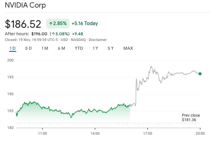 Shares in Nvidia (NVDA) jumped over 5% in after-hours trading on its Q3 earnings to $196 after closing trading on Wednesday up 2.85% to $186.52.